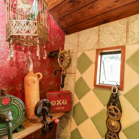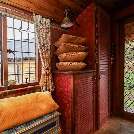 The Gypsy Caravan villa houses a full kitchen with an electric kettle, a refrigerator, and glassware.